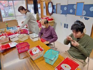 クリスマスに向けての商品づくり!! 日中支援 わかくさ障害者作業所 2025.11.27 NPO法人トゥギャザー様より毎年依頼がある、クリスマス商品の内職に取り組んでいます。児童養護施設に送られるとのことで、丁寧に気持ちを込めて商品詰めに取り組んでいます。
